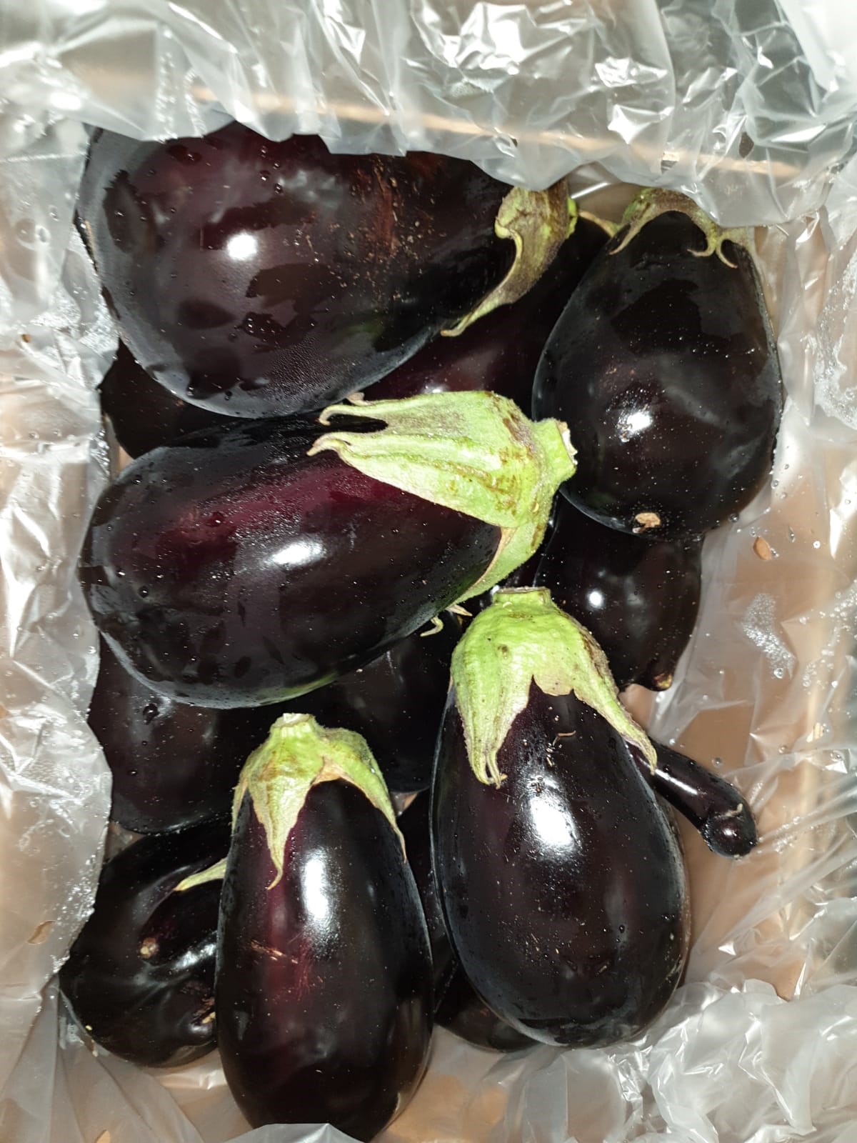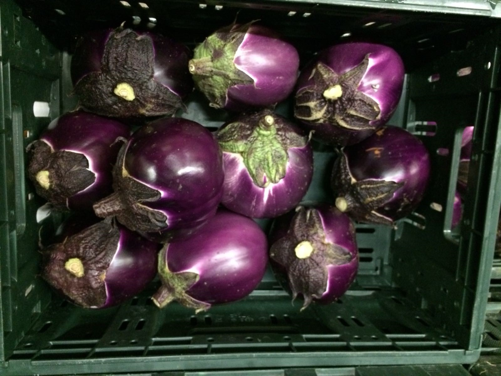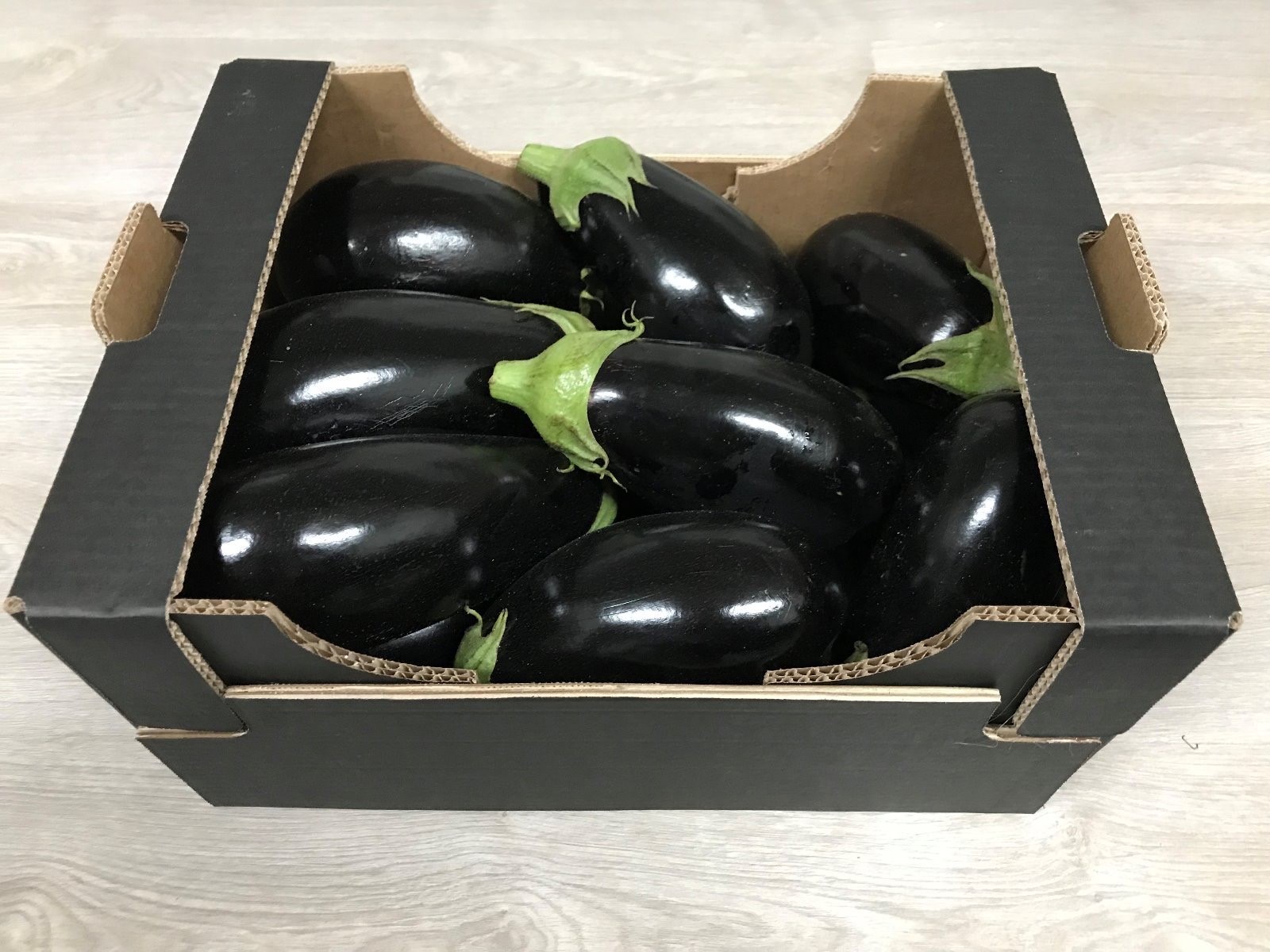 Aubergines are packed in cardboard boxes and RPC (reusable plastic containers).