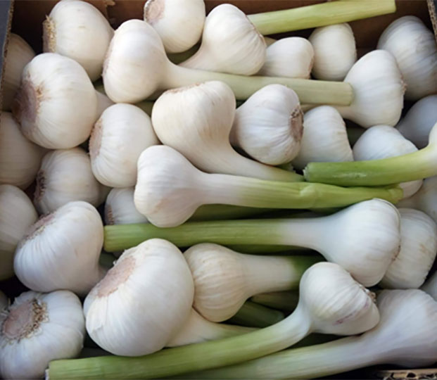 Garlic is offered in cardboard boxes. We commercialize both fresh and dried red and white garlic.
